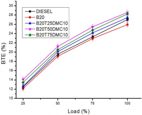►Physiochemical properties of nano additives and DMC alcohol-based additive improved the BTE By 6.13% and reduced BSFC By 17.64% for the B20T50DMC10 blend which is due to the enhanced physiochemical properties of nano-alcohol based B20 blend.