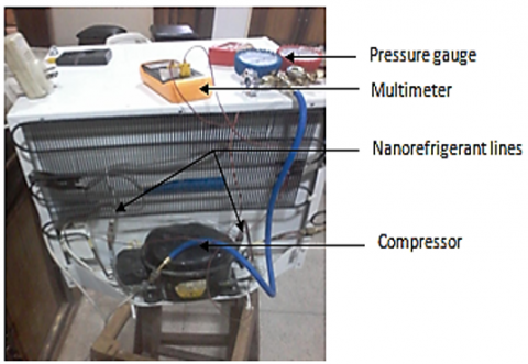 The pre-developed nano-refrigerant was applied in a domestic refrigerator set-up (Figure 3) with additional apparatus including the pressure gauges, thermocouples, and watt-meter. The nanoparticles were dispersed into 250 ml of the mineral oil at different volume concentrations then each fed into the domestic refrigerator’s compressor system. The experiment was run for 240 minutes with parameters such as pull down time, power consumption, coefficient of performance, refrigerating effect, and heat capacity and viscosity gotten.