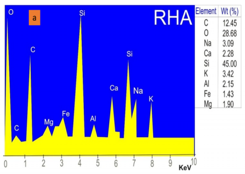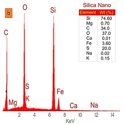 The Electro-Dispersive X-ray spectroscopy (EDS) was used to determine the composition of elements in the synthesized SiO2 nanoparticles and Rice husk ash. The micrograph in the Figure 4 for the Rice husk ash shows the percentage of silica in the sample. Nine elements were detected with varying concentrations with silica having the highest percentage concentration. The SiO2 Nanoparticles were also analyzed using the Electro-Dispersive X-ray spectroscopy. The results showed an increased concentration of silica, Si (74.60%), with comparatively high concentrations of carbon and oxygen. The greater concentration being silica assures that the nanoparticles are silica nanoparticles. The nanoparticles were also analyzed through the spectrometer for the FT-IR analysis. This was used to identify organic materials. The technical technique obtained an infrared spectrum of absorption or emission of the particles while concurrently measuring its intensity over a limited range of wavelengths per time.