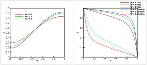 The governing equations of nanofluid flow are not change by the presence or absence of surface radiation; also, the isothermal boundary conditions are not affected by the presence or absence of surface radiation. The effect of surface radiation on free convection is done only through the adiabatic thermal conditions in the adiabatic walls. In the absence of radiation the adiabatic condition means that the convective flux is zero in adiabatic wall, while with radiation the adiabatic condition becomes that the sum of the fluxes due to convection and radiation is zero.