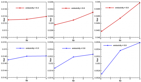 The second is the effect of surface radiation change of cavity internal walls (emissivity ε=0, 0.3, 0.6 and 0.9) on flow structure and convective transport characteristics of nanofluid for different values of Nr (Nr=0.1, 2, and 4).