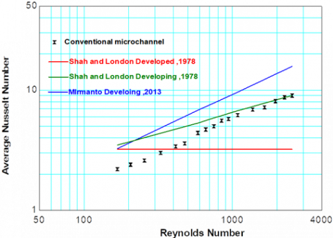 According to the findings of the experiments, the experimental friction factor may be properly predicted for two models by utilizing a traditional correlation of developing flow in a laminar zone. This is the case for both of the models. In the laminar zone, the experimental Nusselt number has a high degree of congruence with both conventional and microchannel correlations.