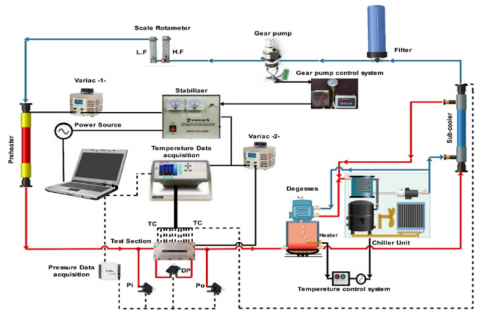 1: Degasses 2: Main Tank 3: Filter 4: Micro-Gear Pump 5: Flow meter 6: Pre-Heater 7: Test-Section 8: Sub-Cooler 9: Data Logger 10: DAQ-NI-6009 11: Pump Controller 12: AC-Stabilizer 13: Unit Power Supply 14: Variac 15: Chiller Unit