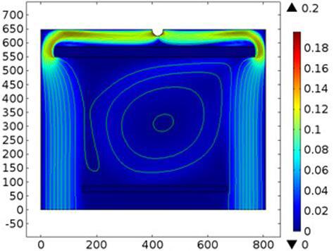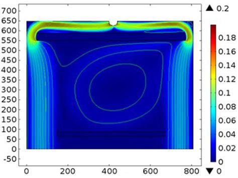 Figure 5 shows that when the time was increased to 1,500 seconds, the velocity at the left and right walls of the cavity is 0.06 m/s for the regulated temperature of 323.0 K (Figure 5(a)), 333.0 K (Figure 5(b)), and 343.0 K (Figure 5(c)). The velocity in the cavity has a maximum value of 0.10 m/s at its top, whereas it is 0.03 m/s at its bottom for the regulated temperature of 323.0K (Figure 5(a)). It has a maximum value of 0.13 m/s at its top, and a maximum value of 0.03 m/s at its bottom for the regulated temperature of 333.0 K (Figure 5(b)). The maximum value of the velocity at the top of the cavity is 0.13 m/s, but it is 0.03 m/s at its bottom for the regulated temperature of 343.0 K (Figure 5(c)). Thus, it can be seen that the values obtained for the time of 1,500 seconds are the same as those for the time of 900 seconds.