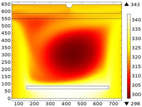 At the time of 0 second (Figure 10), the isotherm in the cavity for the regulated temperature of 323.0K Figure 10(a)), 333.0K (Figure 10(b)), and 343.0 K (Figure 10(c)) is 298.0 K. It is shown in Figure 11 that at the time of 300 seconds, the maximum and minimum isotherms are 320.0 K and 310.0 K, respectively, for the regulated temperature of 323.0 K (Figure 11(a)); 330.0 K and 314.0 K, respectively, for the regulated temperature of 333.0 K (Figure 11(b)); and 340.0 K and 319.0 K, respectively, for the regulated temperature of 343.0 K (Figure 11(c)).