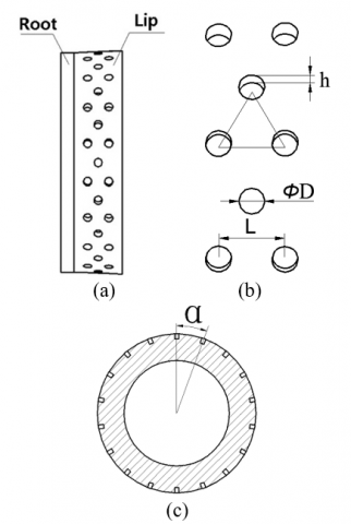 Figure 1. Pitted piston leather cup: (a) Piston leather cup; (b) Pit arrangement; (c) Cross section of leather cup