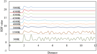 Figure 6 shows the RDF value of ions (Na+, Ca2+, and SO42-) at different distances (radial distances) at different temperatures (300K, 2000K, 4200K, and 5000K). RDF is used to describe the average density of particles (ions in this case) within a given distance range. A high RDF value indicates high density or clustering, while a low RDF value indicates low density or less clustering.