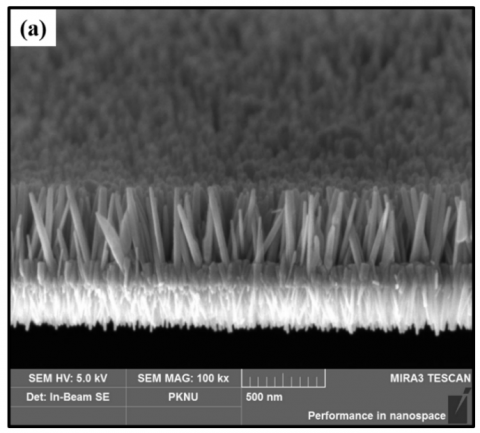 To examine the slippery effects on the droplet impact dynamics, we produced a few lubricant-infused surfaces with similar geometrical morphologies but varying lubricant oil viscosities. We bought zinc powder (for evaporation, 99.998%), zinc nitrate hexahydrate (Zn(NO3)26H2O, 98%), and ammonium hydroxide (28 wt% NH3 in water, 99.99%) from Aldrich. A photoresist (AZ5214, AZ electronic materials) and a developer (AZ500MIF, AZ electronic materials) were used to pattern the substrate. Thermal evaporation was used to deposit a layer of zinc oxide onto a silicon substrate. You can use this straightforward evaporation technique on a variety of substrates. The zinc metal layer was between 200 and 250 nm thick. In order to make 20 mM solutions, a calculated quantity of zinc nitrate hexahydrate was dissolved in 200 mL of de-ionized water. To change the pH of the growth fluid, ammonia water (NH4OH) (28 weight percent NH3 in water, 99.99%) was successively added. Depending on the proportion of zinc salt and desired pH, 7.5 mL of ammonia water was added. A Teflon-capped glass bottle containing the growth fluid was used to suspend the Zn/Si substrate upside down during the hydrothermal growth of ZnO nanorods. The chosen growing temperature was 60℃, and the normal development period was 6 hours. The substrate was taken out of the solution after growth, washed with de-ionized water, and dried. The substrate was patterned using the standard photolithography procedure. At a speed of 3000 rpm, a photoresist was spin-coated onto a substrate for 60 seconds. The substrate went through a series of steps including baking, UV exposure of 360 nm precise time of 15 minutes, and development, washing, and drying. A ZnO nanorod array on a patterned substrate was selectively grown using the aforementioned solution technique. A scanning electron microscope (SEM) images of nano-rods are shown in Figure 1. Additionally, we have prepared LISs by coating the textured ZnO surfaces with Krytox GPL series oil. As stated in Table 1, three different lubricating oils were employed, including Krytox GPL-101, 105, and 107. Until the surface was totally saturated, oil was poured onto it. In order to remove any remaining oil and create a homogenous layer of oil, the surface was then maintained inclined for 24 hours. The thickness of the lubricants should be comparable to the height of the nano-pillars (6 µm) in order for the oil to fully enter and remain in the area between them. Last but not least, we created four different types of surfaces, including ZnO-textured surfaces devoid of any lubricant film. Water droplets on the prepared slanted samples (10°) were used in the slippery testing.
