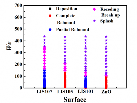 Initially, experiments were performed for various Weber number to investigate the droplet impact dynamics on ZnO textures with and without lubricants. Three types of lubricants used with different viscosities are as shown in the Table 1. The detailed droplet impact event map with increase of We number on ZnO textures with and without lubricants is shown in Figure 3(a). The droplet impact events that were observed matched those described in the literature [21]. The droplet impact process on ZnO surfaces can result in a variety of impact behaviors, including deposition, full rebound, partial rebound, receding breakup, and splash. Using three different lubricants (GPL-101, GPL-105, and GPL-107) on these surfaces, we divided the drop impact behavior into three portions (LIS101, LIS105, and LIS107). This study examines how the physical characteristics of lubricating oils and droplet impact velocity affect the results of drop impacts.