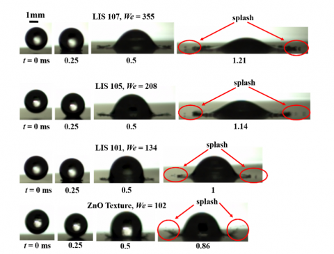 droplet impact, splash, nano-structures, lubricant infused surface, adhesive force