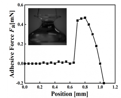 Existing studies looked on sticky super-hydrophobic surfaces' anti-splashing characteristics [34]. For the droplet splash event, zinc oxide (ZnO) nanowires and anodic aluminum oxide (AAO) with sealed air pockets were compared. The results of the aforementioned study showed that the high adhesion force properties of the superhydrophobic AAO surface effectively limit droplet splashing. In contrast, because there was an air layer between the impacting water drop and the solid surface, the ZnO surface induced droplet splashing. Based on the aforementioned study, we considered the adhesive force as an important parameter that can delay droplet splash on lubricant infused ZnO textured surfaces. Therefore, we measured the adhesive (surface) force by considering surface tension and meniscus length wherein the force acts on the relative surface during detachment from the droplet. Thus, we initially placed a droplet of large size with a volume of approximately 60 μl on the surface and then used the DuNouytensiometer to measure interfacial tension as shown in Figure 4(a). In the experiment, we obtained the length along which force acts (L). We then obtained the adhesive (surface) force by using the following expression:
