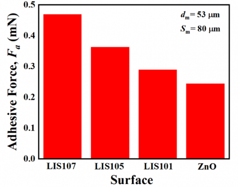 where, σ denotes the surface tension, Fa denotes the adhesive force and L denotes the length where the force acts as shown in Figure 4(a). Thus, adhesive force values are measured on all surfaces in our study as shown in Figure 4(b). Additionally, ZnO textures infused with lubricant GPL107 (LIS107) showed the strongest adhesive force, followed by dry ZnO structured surfaces, LIS105, and LIS101. Based on this analysis, we hypothesise that the high adhesive force on LIS 107 is responsible for the higher values of Wecr, and the very low adhesive force on the dry ZnO textured surface, which results in earlier splashing than on LIS surfaces, is the cause of the lowest value of Wecr.