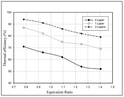 Figure 10. Thermal efficiency at different equivalent ratio values for 0, 1, and 2 layers