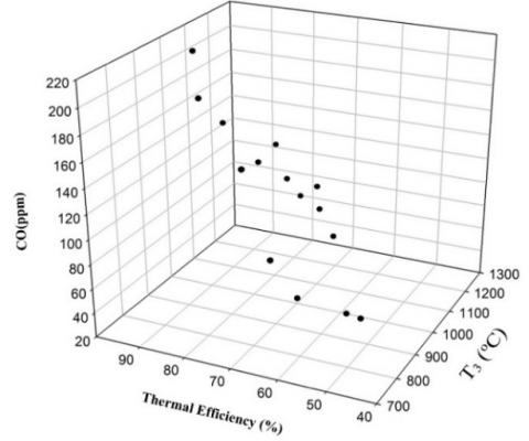 Multi-Objective Optimization process was adopted to find the optimal case to choose the best combustion parameters for the configured burner. The main objective of this experiment is to enhance the performance of the combustion process. In this experimental research a Pareto optimal front (POF) was utilized to find the optimal case to suit research objectives [44]. The maximum thermal efficiency, higher flame temperature, and minimum harmful emission gases are the main objectives in present work. The set of experimental data is illustrated in Figure 11. In this figure, every point was considered as a solution with different number of perforated layer (0, 1, or 2) and different equivalent ratios (0.78, 0.936, 1.092, 1.248, or 1.404). Whereas, the selected outputs were thermal efficiencies, CO concentrations, and flame temperature at the distance of 3cm from the center of the burner.
