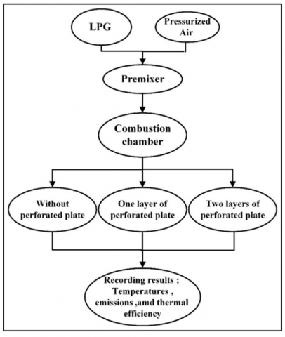 Perforated plates are used in order to have uniform distribution of well-mixed air/fuel mixture and improve combustion efficiency with flame stabilization [26]. Rashwan et al. [27] investigated the effect of partial premixing and oxy-combustion on flame stability using perforated plate combustion chamber. Veetil et al. [28] performed a numerical study of the effect of structure of perforated premixed combustion of flame efficiency. Gamal et al. [29] focused in their experimental study on the effect of hole diameter and plate thickness of perforated plate on enhancing the combustion of LPG burner. Almyali and Dulaimi [30] examined the behaviour of LPG combustion using tubes. A data from numerical and experimental work was under acceptable limits.