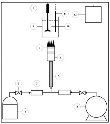 (1) LPG cylinder. (2) Pressure regulator and control valve. (3) Flowmeter. (4) Air pump. (5) Pre-mixer. (6) Combustion chamber. (7) Perforated plate. (8) Vessel. (9) Stirrer. (10) Distilled water. (11) K-type thermocouples. (12) Data acquisition system.