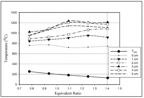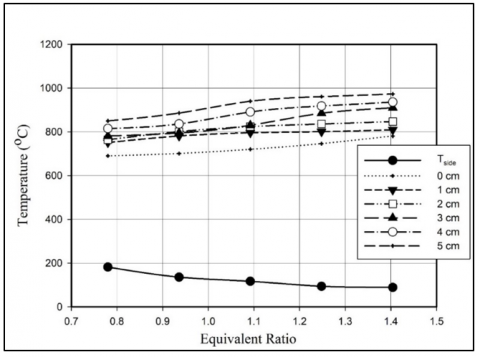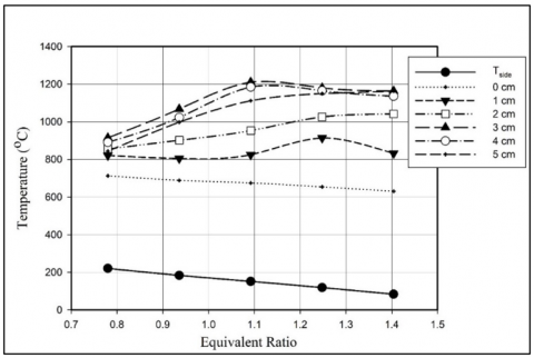 The performance of the perforated plate is dependent on the equivalent ratio. Thus, the relation between the temperatures in the outer regions of the stove and different values of equivalent ratio was conducted in this research. The influence of existing perforated layers on flame stability and uniformity is highlighted in Figure 5-7. The relation between the equivalent ratio and temperature was first studied without any perforated layer. Figure 5 shows the equivalent ratio increases as the temperature rise. In contrast, the amount of air needed for combustion depends on the type of fuel. In order to ensure optimum fuel combustion, the required amount of air should be provided. The premixing of air and fuel ensures maximum smooth combustion with low energy losses [19].