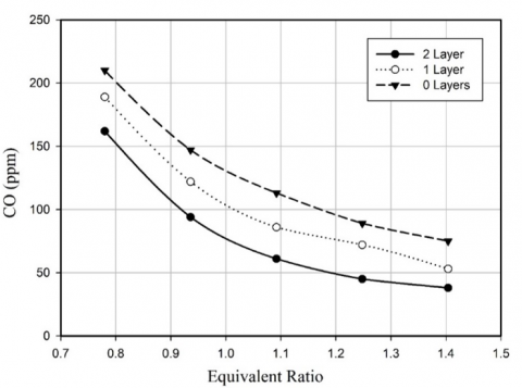 Figure 8. Emissions of CO (ppm) at different equivalent ratio values for 0, 1, and 2 layers
