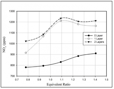Figure 9. Emissions of NOx (ppm) at different equivalent ratio values for 0, 1, and 2 layers