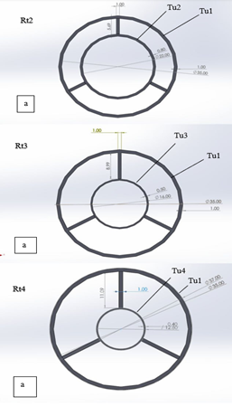 Five Rt models were used in this experimental simulation, depending on the inflow from the central or peripheral pipes, to determine the most improved heat transfer. They had various arrangements based on overlapping and reversible flows. Each proposed Rt was built using a three-tube model with varying hydraulic diameters Hd, in addition to the normal model with the normal-shaped tubes. A constant outer tube diameter was used in all models, as shown in Figure 5(a). Tubes (Rt2, Rt3, and Rt4) with inner tubes of different diameters (Tu1, Tu2, and Tu3) are shown in Figure 6.