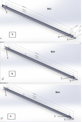 The solar energy simulation was performed using a flat heater (120×1000 mm) based on a parabola-shaped reflector. This reflector reversed the heat flux and prevented dispersion. The tube models were exposed to a heat flux. Four overlapping and reversed tube models (Rt2, Rt3, and Rt4) were used. After optimizing the model from the simulation (Rt4), fins were added to the outer surface of the inner tube to increase heat transfer, resulting in the creation of a fifth model (Rt5). The revised design maintained a constant outer tube diameter (Tu1). However, the inner tubes’ diameters (Tu2, Tu3, and Tu4) were altered, allowing for comparisons between them and against the standard model (Rt1) while maintaining the exact measurement of the outer diameter in the proposed designs.
