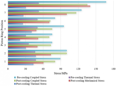 Figure 5. Comparison of piston ring stresses in GDI engines before and after oil chamber cooling