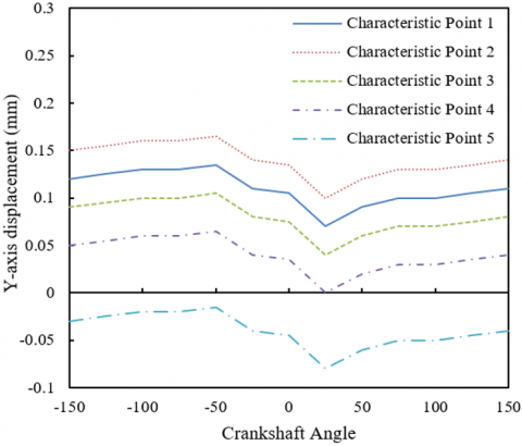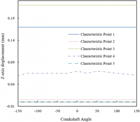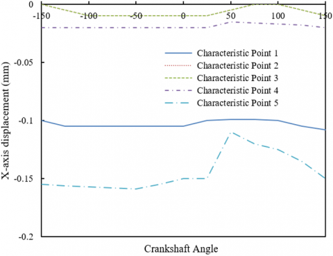 In the three sets of data presented in Figure 7, we observe significant differences in the axial displacement variations of different characteristic points in the piston ring gap of a GDI engine at various crankshaft angles. The first set of data shows that characteristic point 5 has the largest range of displacement changes, from -0.155 to -0.11, indicating that the displacement response at some characteristic points is very sensitive to changes in temperature or mechanical loads. In the second set of data, characteristic points 2 and 3 show relatively large positive displacements, where characteristic point 2 changes from 0.15 to 0.14 and characteristic point 3 from 0.09 to 0.08. The third set of data exhibits more stable displacement conditions, especially for characteristic points 1 and 3, where the displacements remain at fixed values of 0.17 and 0.22, respectively, showing that under certain conditions, some areas may be less affected or their displacements effectively controlled. These detailed displacement data allow for a deeper understanding of the dynamic behavior of the piston ring gap in actual working environments.
