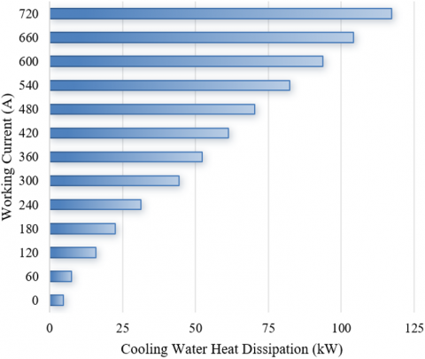 The data shown in Figure 8 reflects the heat dissipation of cooling water in a tested GDI engine under different working currents, where the range of working currents is from 0 to 720 mA, and the cooling water heat dissipation ranges from 4.7 to 117.2 W. The data shows a clear linear increase trend in cooling water heat dissipation as the working current increases. The heat dissipation is 7.6 W at 60 mA and rises to 117.2 W as the current increases to 720 mA. This gradual increasing trend indicates that the engine's thermal load is closely related to the increase in current, thereby affecting the thermal burden on the cooling system. Detailed analysis of this data leads to the conclusion that during the operation of the GDI engine, the required cooling capacity significantly increases with the load. This result validates the importance and accuracy of the thermal analysis and strength analysis methods used in the study, particularly when considering engine design and cooling system optimization. The cooling water heat dissipation data provide an empirical basis for engine temperature control and cooling system design, ensuring engine efficiency and safety under various operating conditions.