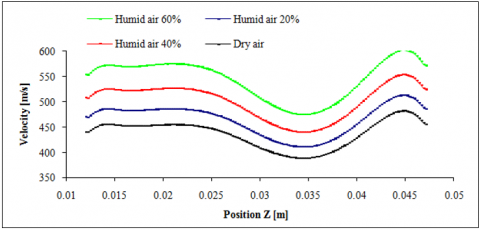 Figures 9 and 10 represent the flow velocity modulus. They show an increase in speed with increasing concentration of humid air. The velocity module decrease due to the geometry of the rotor blade wall which represents a curvature and also the boundary layer which represents the thin fluid layer which is influenced by contact with the wall. Variations in blade profile shape, curvature, and thickness result in differences in the velocity fields, with regions of higher or lower velocity depending on the fan blade profile. The values of the speed curves at the level of the intrados, the exit speed is slightly higher than the entry speed and the minimum speed is at the point Z=0.035. As for the speed values at the level of the extrados, the curves are decreasing from the input region to the end of the output region, that is to say that the higher the value of Z, the lower the value of the speed.