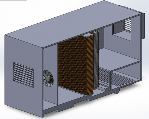 In three stages cooling system, a big air fan has been placed in the ceiling of the evaporation cooling system unit to give enough space for entering the hot air into the system, as well as when change the system from three stages to two stages cooling system just close or remove the ceiling fan. While in both three and two stages cooling system, the second fans were (two small fans) to give high opportunity for air path to move on.