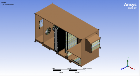 In the current investigation, 10-row chilled water-cooling coils with dimensions of 75cm in length, 0.0125m in diameter, and 5cm between each coil have been employed. For implementing the boundary conditions, the complete coil set was contained in a rectangular cube with dimensions of 2 meters long by 0.75 meters wide by 1 meters high [23] depicts the indirect evaporative cooling system's geometry, as shown in Table 1.