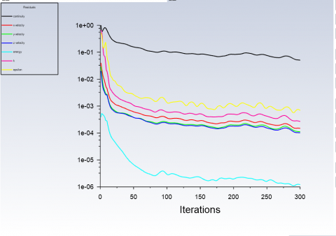 Upon conducting 300 computations and executing the relevant computations, the resultant iteration graph was visualized within the Fluent interface. The residual velocity graphs for 300 iterations in the direction of continuity, (x, y & z)-velocity, k and omega are depicted in Figure 4.