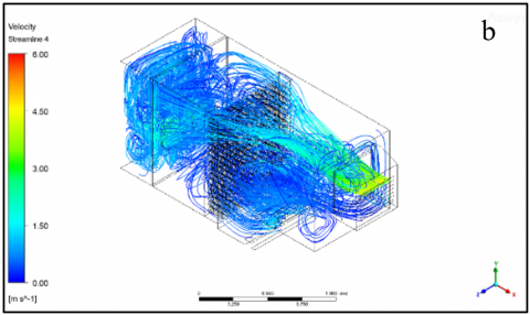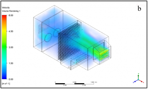 Figure 6(a-c) demonstrate that the velocity volume rendering magnitudes have not changed in two stages evaporative cooling system and increasing the weather temp from 12.5 to 45 degrees centigrade are changed due to absence of water pad that change the surrounding environment.