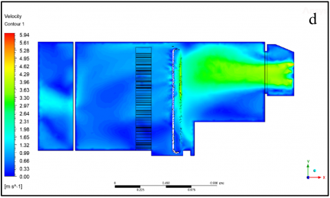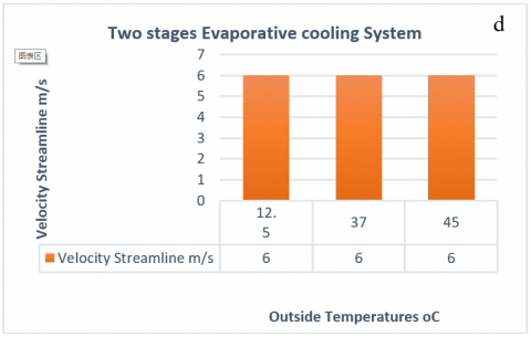 Figure 5(a-c) show the streamline distribution of cooling three stages evaporating system with three different temps (12.5, 37 and 45) degree centigrade. In two stages evaporative cooling system the velocity streamline magnitudes are constant despite changing the inlet temps. From Figure 5(d) demonstrates that the velocity streamline magnitudes have not changed in two stages evaporative cooling system and increasing the weather temp from 12.5 to 45 degrees centigrade are changed due to absence of water pad that change the surrounding environment.