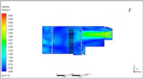 Figure 6(d-f) show the velocity counter distribution of cooling two stages evaporating system with three different temps (12.5, 37 and 45) degree centigrade. In two stages of evaporative cooling system the velocity counter magnitudes are reduced with increasing the weather temps from 12.5 to 37 degree centigrade constant but increasing the weather temp to 45 has no effective change on velocity counter.
