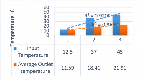 With two stages evaporative cooling, the temperature distribution counter for three selected months is shown in figure Figures 7(a-c). Based on simulation results increasing the input temperature with similar inlet velocity 6m/s the reduction in the temperatures were increase with increased the inlet temperature. In February with 12.5℃, the cooling system was reduced the temperature to 11.59℃, while with increasing the temperature in October and July (37, 45℃) show reduction to 50% and more. And the obtained results from ANSYS software show good correlation between increasing temperature and reduction temperature when using two stages evaporative cooling system as shown in Figure 7(d).