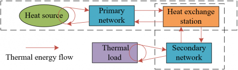 Figure 1 presents the structure diagram of the low-carbon urban energy system. This paper makes significant adjustments to traditional thermodynamic system modeling methods to suit the needs of low-carbon ecological city design. Traditional thermodynamic systems mainly include heat sources, primary networks, heat exchange stations, and heat loads, focusing on the production, transmission, exchange, and final use of thermal energy. Figure 2 shows the relationships between the basic components of the thermodynamic system. However, in the design of low-carbon ecological cities, thermodynamic system modeling needs to more comprehensively consider energy efficiency, environmental impact, and the integration of renewable energies. Firstly, this paper focuses on the primary network, i.e., the main transmission system in the thermodynamic system, and analyzes the heat exchange stations as heat loads. Considering that the secondary network can be neglected due to its shorter length and relatively lower energy consumption, this model emphasizes optimizing the efficiency of the primary network and reducing its energy loss. In the low-carbon modeling approach, this paper not only focuses on the recycling of thermal energy but also enhances the system's capacity to absorb renewable energies, such as solar or geothermal energy, thereby reducing dependence on fossil fuels. Moreover, thermodynamic system modeling in low-carbon ecological city design also emphasizes system operation optimization, including the use of advanced thermodynamic principles and algorithms to predict and manage the flow of thermal energy, ensuring maximum energy efficiency and minimal environmental impact of the heat network. This approach, while considering the complexity of urban energy systems, will also introduce more data and real-time monitoring to achieve dynamic optimization and higher operational flexibility of the thermodynamic system.