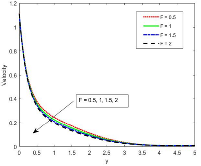 Figure 10 implies as the radiation parameter rises, the velocity declines due to greater heat loss through thermal radiation. This reduces the temperature gradient and consequently, the buoyancy forces driving the flow. The weakened buoyancy forces result in lower fluid velocities. Mechanism analysis: The radiation parameter (R) quantifies the relative influence of radiative transfer of heat compared to thermal conduction. A higher R indicates increased energy loss from the system due to thermal radiation. Since buoyancy forces depend on temperature differences, a reduced temperature gradient weakens the driving force for fluid motion. As buoyancy forces decrease, the fluid's capability to counteract viscous resistance declines, causing lower flow velocities. The interaction between radiation and buoyancy plays an important role in varied engineering and environmental applications.