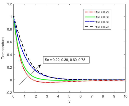 As the Sc boosts up, the velocity falls off because higher Sc are associated with lower mass diffusivity and higher momentum diffusivity. It is well depicted in Figure 9. Mechanism analysis: The Sc represents the ratio of momentum transfer rate to mass diffusivity. A higher Sc denotes greater momentum diffusivity, which amplifies the influence of viscous forces. Increased viscous resistance results in steeper velocity gradients within the boundary layer. As a consequence, the intensified viscous effects hinder fluid motion, leading to a reduction in overall velocity.