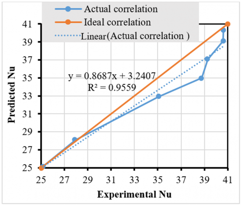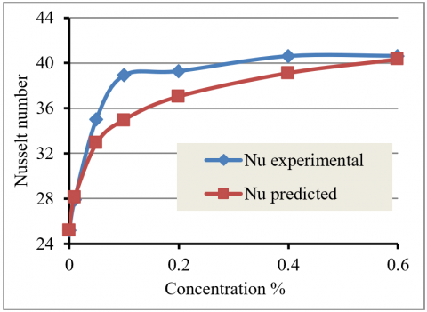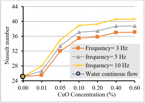 To further demonstrate the ability of the developed correlation to estimate the Nu, Figure 10 has been developed to show the experimental and predicted Nu results. The maximum difference between the experimental and predicted Nu values is 12.4%, and the mean difference over the entire tested CuO-water nanofluid concentration range is 3.96%, which provides further evidence of the correlation accuracy and ability to mathematically predict the Nu for oscillatory CuO-water nanofluid flows.