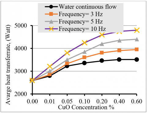 Previous studies have highlighted the need for an alternative solution to optimize the heat performance of nanofluids while minimizing the associated pressure drop. To that end, the use of high-concentration nanoparticles is avoided, while low concentration ones are utilities. One effective technique involves improving the fluid mixing and generating a vortex, which can be obtained by tailoring the flow pattern and increasing the turbulence at the inlet. For instance, Naphon and Wiriyasart [15] and Wang and Zhang [33] utilized a range of pulsating flows to enhance the Brownian motion and turbulences. At the same time, Alikhan and Maghrebi [34] and Alasady and Maghrebi [35] experienced the impact of constant pulsating flow on the plate heat exchanger performance with hybrid nanofluids. The results demonstrated that applying the pulse frequency with low hybrid nanoparticle concentration enhanced the Nu and slightly increased pressure drop.