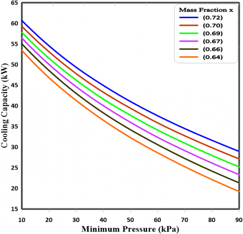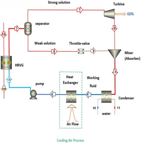 In the modified Kalina cycle (MKCS) for cogeneration, as shown in Figure 2, a heat exchanger is used to obtain air cooling and power from the turbine. The modification cycle includes heat restore vapor generation (HRVG), a separator, a turbine, a throttle valve, a mixer (absorber), a condenser, a heat exchanger, and a working fluid pump. The evaporator temperature range selected for this analysis is 180℃ to 190℃. The binary ammonia-water mixture of the cycle absorbs waste heat at (HRVG), transitioning into the wet-vapor phase (region 7). It then enters the vapor-liquid separator at high temperatures and pressure. It is divided into saturated vapor as a strong solution of the mixture (region 1) and saturated liquid as a weak solution of the mixture (region 8). The saturated vapor (region 1) is directed to the turbine (expander), which extracts work from the strong solution and expands it to the turbine’s exhaust (region 2). Meanwhile, the saturated liquid (region 8) enters the throttle valve, where its pressure and temperature are reduced in the isenthalpic process, reaching position (region 9); then both the vapor stream from the turbine exit (region 2) and the liquid stream from the throttle valve exit (region 9) are blended in the mixer (absorber) to produce a wet-vapor working fluid again, with a dryness fraction of 0.44 at the state (region 3). and the component ammonia-water mixture at state (3) is condensed in the condenser to form a saturated liquid (region 4) with a low-temperature and low-pressure working fluid, which in turn enters a heat exchanger to generate cooling for the required zone. The working fluid leaves the heat exchanger (HE) as a saturated liquid in a state (region 4). It is drawn by the pump, which moves it to a state (region 5) and then transfers it to a state (region 7) after it has gained heat again at HRVG.