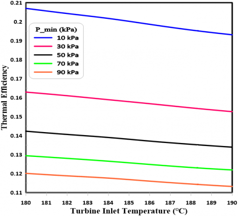 4. The value of the isentropic efficiency for both the turbine and the pump is considered to be 85% and 95%, consecutively.