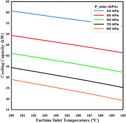 In recent decades, the Kalina cycle (KC) has occupied an important position in exploiting waste heat in many industry applications for cogenerating power and cooling. The KC is enhanced by adding a heat exchanger that is installed after the condenser. This paper is a theoretical analysis of the temperature effect of turbine input on the state of binary solution (ammonia-water) at the exit region of the condenser. The examining range of temperature (180-190℃) is at a constant maximum pressure of 3500 kPa and a dryness fraction of about 0.3; the range of net power output is 25-250 kW, with a varying minimum pressure range from 10 to 90 kPa. The outcome shows that decreasing the turbine inlet temperature (TIT) reduces the working fluid temperature beyond the condenser (T4), consequently enhancing the cooling output at an optimum minimum pressure of 50 kPa and TIT=180℃, the condenser exit temperature (CET) drops to about -3.3℃, which gives a high cooling capacity of 420.7 kW at 250 kW output turbine power. On the other hand, when TIT=190℃, T4 drops to 5.06℃, which gives the lowest cooling capacity of 19.66 kW at 25 kW output turbine power.