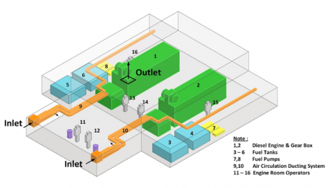 Optimizing ship ventilation is crucial due to its high energy consumption, accounting for 3.5% to 5.5% of a ship's power [4]. Using Computational Fluid Dynamics (CFD), Salmani et al. demonstrated that effective ventilation improves thermal comfort and energy efficiency in ship engine rooms. Additionally, better ventilation helps reduce harmful emissions like NOx and SO2, improving air quality, especially in coastal areas [30]. The physical conditions in engine rooms, such as noise and poor air quality, can harm crew health and performance [31]. Effective ventilation mitigates these risks, improving crew safety and operational efficiency. Furthermore, integrating technologies like thermoprocessors and cooling systems can enhance engine performance, boost fuel efficiency, and reduce emissions [30].