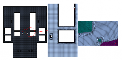 The quality of meshing in the air ventilation system of the ship's engine room, as depicted in the Figure 2, demonstrates careful consideration of slope, aspect ratio, and size. The mesh elements perfectly capture the structural features, ensuring that the physical geometry is accurately represented. The aspect ratios of the elements are mostly regular, with square or slightly rectangular shapes that promote numerical stability for simulations. The element size varies accordingly, having smaller elements in critical areas like edges and corners to capture detailed features, and coarser elements in larger flat areas to optimize computational efficiency. Overall, the meshing quality is well-balanced, providing a solid foundation for accurate and efficient simulations.