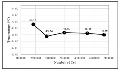 The Grid Independence Test (GIT) ensures that the solution obtained is independent of the mesh size used. This test is achieved by comparing the solution results from a coarse mesh to those from a finer mesh. If the solution does not vary significantly with changes in mesh size, it can be considered grid-independent. The GIT was performed at coordinates x = 2.25 m, y = 1.8 m, and z = 8.65 m under 100% engine load conditions by comparing the temperature values at these points. The table shows that the temperature values did not change significantly with mesh sizes exceeding 4.2 million cells. Since the temperature variation was relatively small, a mesh with 4,265,479 cells was selected. The results of the Grid Independence Test, along with temperature variation graphs for each cell count, are presented in Table 1 and Figure 3.