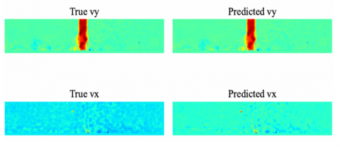 Figure 4 presents a qualitative comparison between the true velocity components and those reconstructed by the convolutional neural network (CNN) model, trained to predict the horizontal (vx) and vertical (vy) components of the flow field in a jet impingement configuration.