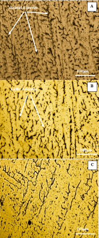 The interpass temperature, as mentioned above, affects the δ to γ transformation inside the welding zone microstructure. Figure 6(A) illustrates the welding zone without interpass temperature microstructure, both lathy δ-ferrite and skeletal δ-ferrite types seen in the structure inside γ matrix. The amount of this δ-ferrite inside the structure will depend on the molten welding metal solidification rate; this fact is proved in Figure 6(B), which shows the microstructure of the welding zone with 100℃ interpass temperature; much more γ matrix can be noted in this morphology due to the effects of the interpass temperature in reducing the cooling rate, Figure 6(C) demonstrated the structure of γ matrix with lathy δ-ferrite type, this type formed in moderate cooling rate region, the formation of this type reflected the effects of the 150℃ interpass temperature in this welding sample.