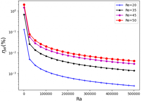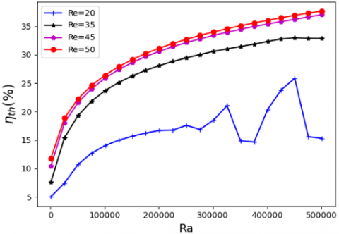 Figure 13 shows the thermal efficiency of the chimney as a function of the Rayleigh (Ra) and Reynolds (Re) numbers. It is observed that the efficiency increases with both parameters. Despite the relatively low values of Ra and Re, a satisfactory performance is achieved $\left(\eta_{\mathrm{el}}=38 \%\right.$ for $\mathrm{Re}=50$ and Ra $=5 \times 10^5$). This represents a significant improvement compared to the $30 \%$ efficiency obtained by Ong and Chow [28] under conditions of a 0.1 m air gap and a heat flux of $200 \mathrm{~W} / \mathrm{m}^2$ (i.e., a Rayleigh number $\mathrm{Ra} \approx 4 \times 10^6$). The oscillations observed for the case where Re = 20 indicate the presence of recirculating flow structures, which hinder the continuous renewal of the fluid, especially when heat transfer is primarily driven by natural convection. These oscillations progressively vanish as the Reynolds number increases, confirming that the addition of kinetic momentum to fluid particles, already subject to buoyancy forces, promotes a more stable flow and enhances continuous fluid renewal within the chimney.